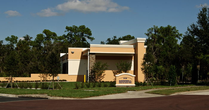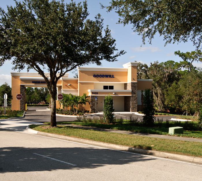 Jon F. Swift, Inc. was charged with building a new Attended Drop-off Center (ADC) for Goodwill in the community of Lakewood Ranch on an undeveloped parcel. The project had to meet the strict building guidelines of the Lakewood Ranch Association. The 2800sf facility includes a drive-through that allows for easy donation drop offs, even during inclement weather. It also has two truck wells for tractor trailer docking to accommodate Goodwill’s massive distribution system. Finished interior floors are polished concrete to take advantage of a practical low cost, low maintenance option that was well suited for the facility. This particular ADC included a small office for Goodwill’s job placement program.