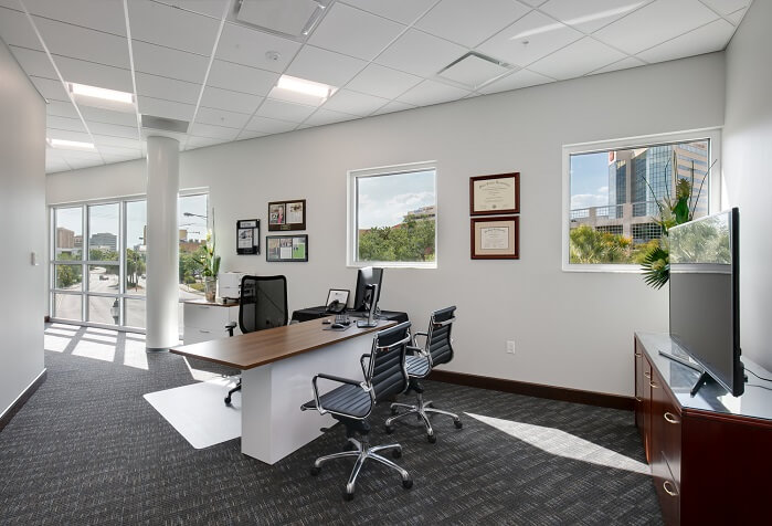 The scope of work consisted of building open and closed office areas, conference rooms, a waiting area and a teller area. The design called for storefront glass to give the space a feeling of openness and light.